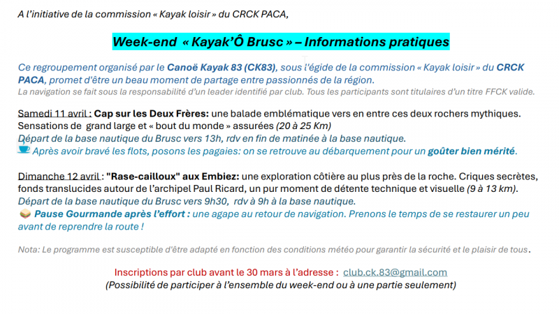 Dans le cadre de la commission « kayak loisir » du CRCK (Comité Régional), le CK83 organisera les 11 & 12 avril prochain un rassemblement interclubs. Programme et informations pratiques ci-dessous: